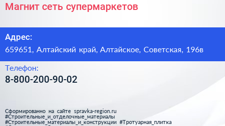 Магнит, сеть супермаркетов по адресу 659651, Алтайский край, Алтайское, Советская, 196в в дальнейшем Организация, размещена в следующих категориях: