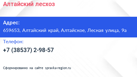 Алтайский лесхоз по адресу 659653, Алтайский край, Алтайское, Лесная улица, 9а в дальнейшем Организация, размещена в следующих категориях: