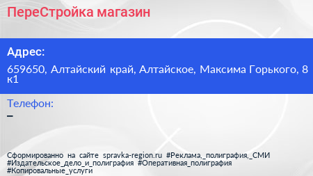 ПереСтройка, магазин по адресу 659650, Алтайский край, Алтайское, Максима Горького, 8 к1 в дальнейшем Организация, размещена в следующих категориях: