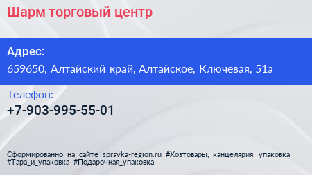 Шарм, торговый центр по адресу 659650, Алтайский край, Алтайское, Ключевая, 51а в дальнейшем Организация, размещена в следующих категориях: