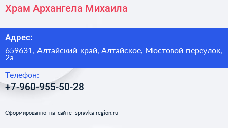 Храм Архангела Михаила по адресу 659631, Алтайский край, Алтайское, Мостовой переулок, 2а в дальнейшем Организация, размещена в следующих категориях:
