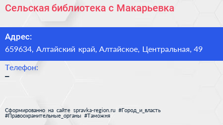 Сельская библиотека, с. Макарьевка по адресу 659634, Алтайский край, Алтайское, Центральная, 49 в дальнейшем Организация, размещена в следующих категориях: