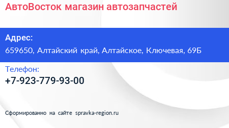 АвтоВосток, магазин автозапчастей по адресу 659650, Алтайский край, Алтайское, Ключевая, 69Б в дальнейшем Организация, размещена в следующих категориях: