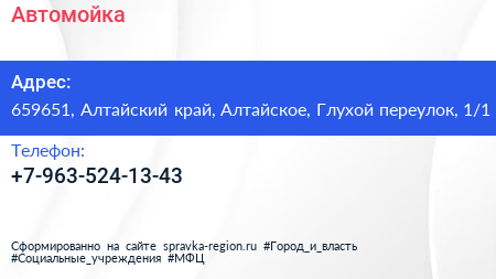 Автомойка по адресу 659651, Алтайский край, Алтайское, Глухой переулок, 1/1 в дальнейшем Организация, размещена в следующих категориях: