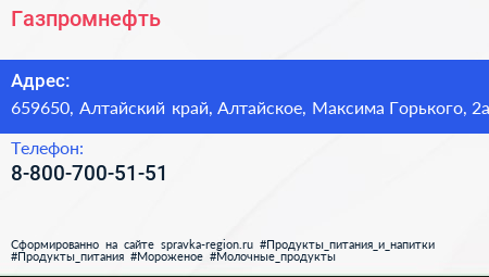 Газпромнефть по адресу 659650, Алтайский край, Алтайское, Максима Горького, 2а в дальнейшем Организация, размещена в следующих категориях: