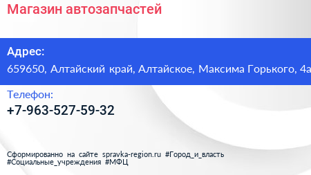 Магазин автозапчастей по адресу 659650, Алтайский край, Алтайское, Максима Горького, 4а в дальнейшем Организация, размещена в следующих категориях: