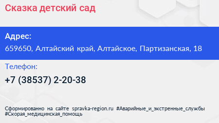 Сказка, детский сад по адресу 659650, Алтайский край, Алтайское, Партизанская, 18 в дальнейшем Организация, размещена в следующих категориях: