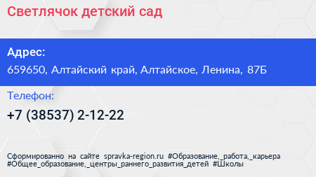 Светлячок, детский сад по адресу 659650, Алтайский край, Алтайское, Ленина, 87Б в дальнейшем Организация, размещена в следующих категориях: