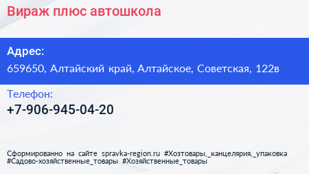 Вираж плюс, автошкола по адресу 659650, Алтайский край, Алтайское, Советская, 122в в дальнейшем Организация, размещена в следующих категориях:
