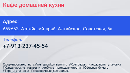 Кафе домашней кухни по адресу 659653, Алтайский край, Алтайское, Советская, 5а в дальнейшем Организация, размещена в следующих категориях: