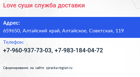 Love суши, служба доставки по адресу 659650, Алтайский край, Алтайское, Советская, 119 в дальнейшем Организация, размещена в следующих категориях: