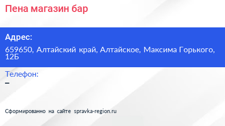 Пена, магазин-бар по адресу 659650, Алтайский край, Алтайское, Максима Горького, 12Б в дальнейшем Организация, размещена в следующих категориях: