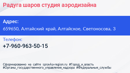 Радуга шаров, студия аэродизайна по адресу 659650, Алтайский край, Алтайское, Светоносова, 3 в дальнейшем Организация, размещена в следующих категориях:
