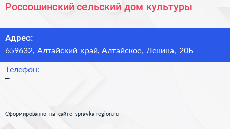 Россошинский сельский дом культуры по адресу 659632, Алтайский край, Алтайское, Ленина, 20Б в дальнейшем Организация, размещена в следующих категориях: