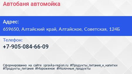 Автобаня, автомойка по адресу 659650, Алтайский край, Алтайское, Советская, 124Б в дальнейшем Организация, размещена в следующих категориях:
