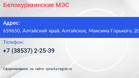 Белокурихинские МЭС по адресу 659650, Алтайский край, Алтайское, Максима Горького, 20 в дальнейшем Организация, размещена в следующих категориях: