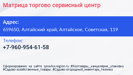 Матрица, торгово-сервисный центр по адресу 659650, Алтайский край, Алтайское, Советская, 119 в дальнейшем Организация, размещена в следующих категориях: