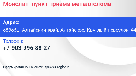 Монолит+, пункт приема металлолома по адресу 659651, Алтайский край, Алтайское, Круглый переулок, 44 в дальнейшем Организация, размещена в следующих категориях: