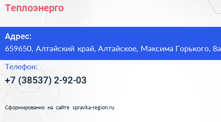 Теплоэнерго по адресу 659650, Алтайский край, Алтайское, Максима Горького, 8а в дальнейшем Организация, размещена в следующих категориях: