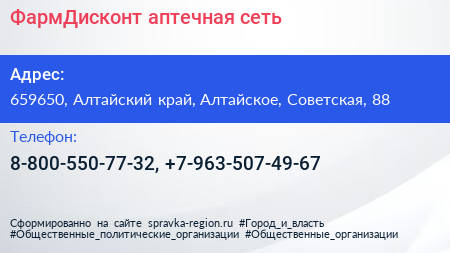 ФармДисконт, аптечная сеть по адресу 659650, Алтайский край, Алтайское, Советская, 88 в дальнейшем Организация, размещена в следующих категориях: