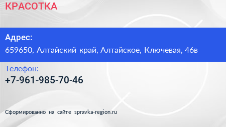 КРАСОТКА по адресу 659650, Алтайский край, Алтайское, Ключевая, 46в в дальнейшем Организация, размещена в следующих категориях:
