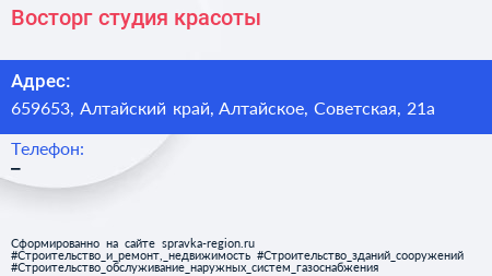 Восторг, студия красоты по адресу 659653, Алтайский край, Алтайское, Советская, 21а в дальнейшем Организация, размещена в следующих категориях: