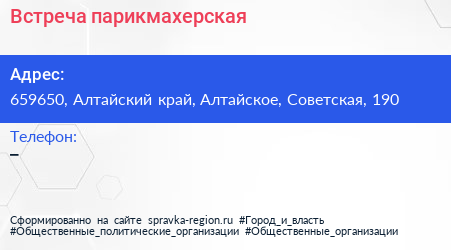 Встреча, парикмахерская по адресу 659650, Алтайский край, Алтайское, Советская, 190 в дальнейшем Организация, размещена в следующих категориях:
