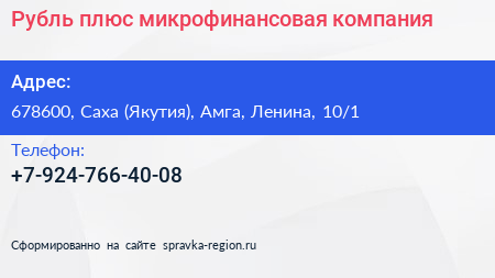 Рубль плюс, микрофинансовая компания по адресу 678600, Саха (Якутия), Амга, Ленина, 10/1 в дальнейшем Организация, размещена в следующих категориях:
