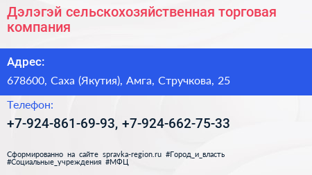 Дэлэгэй, сельскохозяйственная торговая компания по адресу 678600, Саха (Якутия), Амга, Стручкова, 25 в дальнейшем Организация, размещена в следующих категориях:
