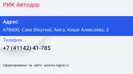РИК Автодор по адресу 678600, Саха (Якутия), Амга, Кеши Алексеева, 2 в дальнейшем Организация, размещена в следующих категориях: