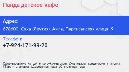 Панда, детское кафе по адресу 678600, Саха (Якутия), Амга, Партизанская улица, 9 в дальнейшем Организация, размещена в следующих категориях: