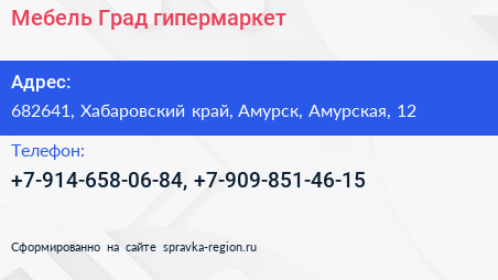 Мебель-Град, гипермаркет по адресу 682641, Хабаровский край, Амурск, Амурская, 12 в дальнейшем Организация, размещена в следующих категориях: