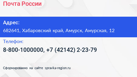 Почта России по адресу 682641, Хабаровский край, Амурск, Амурская, 12 в дальнейшем Организация, размещена в следующих категориях: