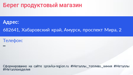 Берег, продуктовый магазин по адресу 682641, Хабаровский край, Амурск, проспект Мира, 2 в дальнейшем Организация, размещена в следующих категориях: