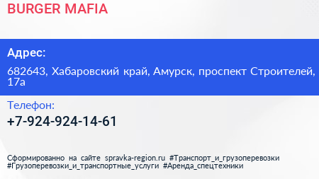 BURGER MAFIA по адресу 682643, Хабаровский край, Амурск, проспект Строителей, 17а в дальнейшем Организация, размещена в следующих категориях:
