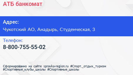 АТБ, банкомат по адресу Чукотский АО, Анадырь, Студенческая, 3 в дальнейшем Организация, размещена в следующих категориях: