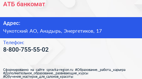 АТБ, банкомат по адресу Чукотский АО, Анадырь, Энергетиков, 17 в дальнейшем Организация, размещена в следующих категориях: