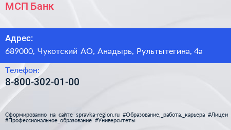 МСП Банк по адресу 689000, Чукотский АО, Анадырь, Рультытегина, 4а в дальнейшем Организация, размещена в следующих категориях: