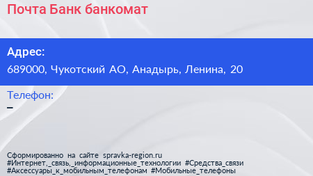 Почта Банк, банкомат по адресу 689000, Чукотский АО, Анадырь, Ленина, 20 в дальнейшем Организация, размещена в следующих категориях: