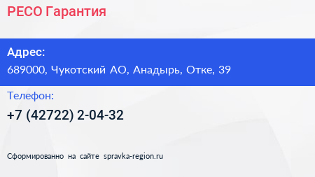 РЕСО-Гарантия по адресу 689000, Чукотский АО, Анадырь, Отке, 39 в дальнейшем Организация, размещена в следующих категориях: