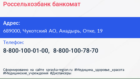 Россельхозбанк, банкомат по адресу 689000, Чукотский АО, Анадырь, Отке, 19 в дальнейшем Организация, размещена в следующих категориях: