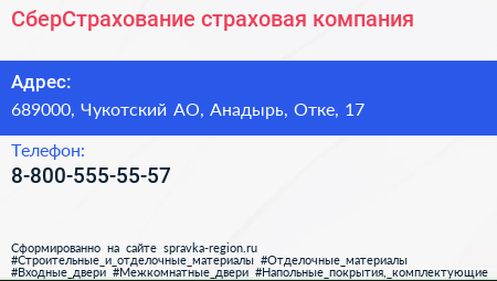 СберСтрахование, страховая компания по адресу 689000, Чукотский АО, Анадырь, Отке, 17 в дальнейшем Организация, размещена в следующих категориях: