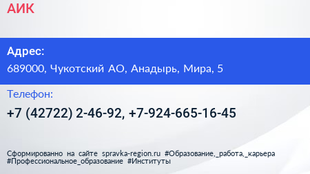 АИК по адресу 689000, Чукотский АО, Анадырь, Мира, 5 в дальнейшем Организация, размещена в следующих категориях:
