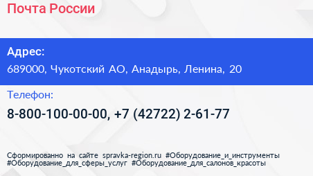 Почта России по адресу 689000, Чукотский АО, Анадырь, Ленина, 20 в дальнейшем Организация, размещена в следующих категориях: