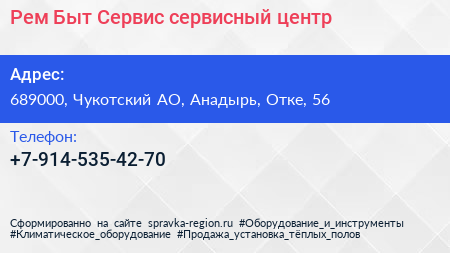 Рем Быт Сервис, сервисный центр по адресу 689000, Чукотский АО, Анадырь, Отке, 56 в дальнейшем Организация, размещена в следующих категориях: