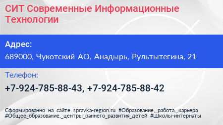 СИТ: Современные Информационные Технологии по адресу 689000, Чукотский АО, Анадырь, Рультытегина, 21 в дальнейшем Организация, размещена в следующих категориях: