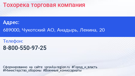 Тохорека, торговая компания по адресу 689000, Чукотский АО, Анадырь, Ленина, 20 в дальнейшем Организация, размещена в следующих категориях: