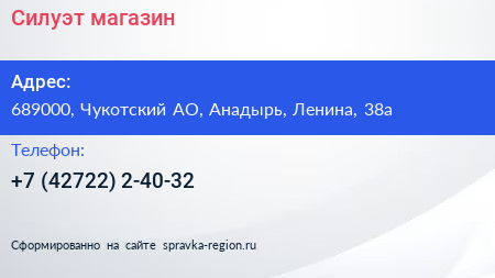 Силуэт, магазин по адресу 689000, Чукотский АО, Анадырь, Ленина, 38а в дальнейшем Организация, размещена в следующих категориях: