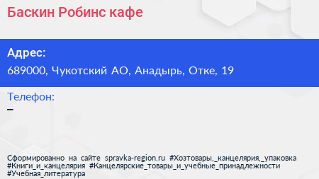 Баскин Робинс, кафе по адресу 689000, Чукотский АО, Анадырь, Отке, 19 в дальнейшем Организация, размещена в следующих категориях: