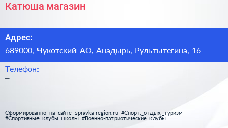 Катюша, магазин по адресу 689000, Чукотский АО, Анадырь, Рультытегина, 16 в дальнейшем Организация, размещена в следующих категориях: